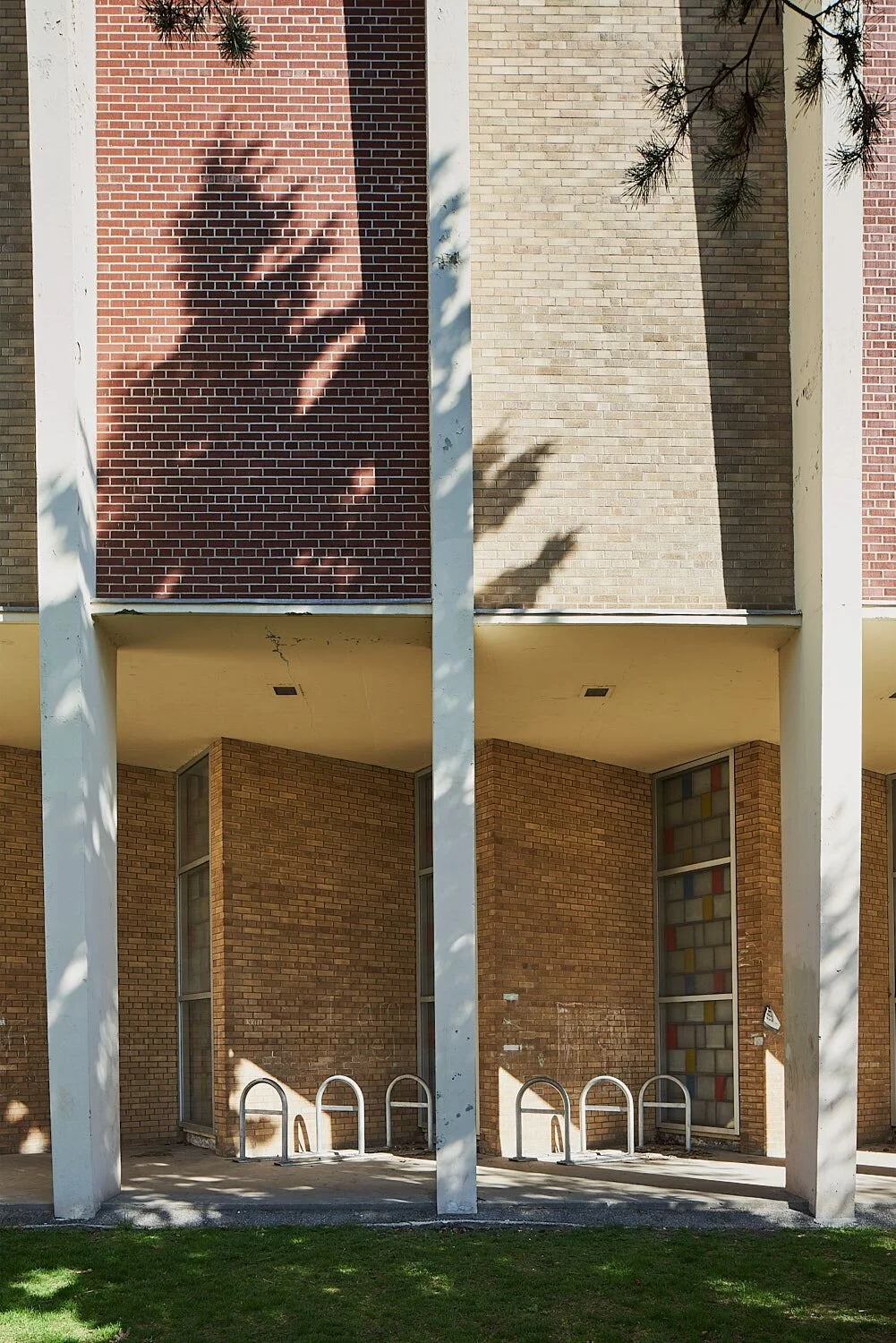 The architecture is highly expressive; the new lobby includes a diagonal grid of coloured glass, and the athletic wing is topped by shouldered arches of precast concrete, flanking alternating bands of red and yellow brick. Windows to the pool are prefabricated, multicoloured panels identical to those employed at Osler P.S. and Parkway Vocational.
